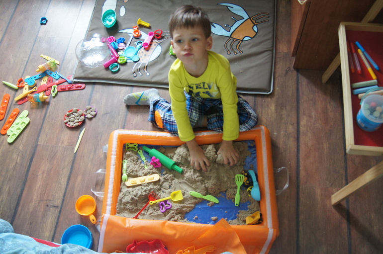 А вот живой песок мы со времени покупки достали раза три, дитенку что ли на ощупь не нравится он, непонятно...Зато кинетический идет на ура, я раД))) Возится с ним, кашеварит, разбивает яйца в тесто (делает яички в игрушечной чашке, получается такими полукруглыми, похожими), даже ночью во сне сегодня бормотал: "Разбить яйца, яйца разбить."))) Только убирать геморно, он играет так, что все вокруг в песке, на ногах тоже, переносит этот песок по всему дома, я только и убираю, благо не рассыпается как обычный песок, а лежит себе кучками.