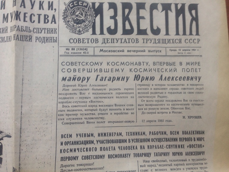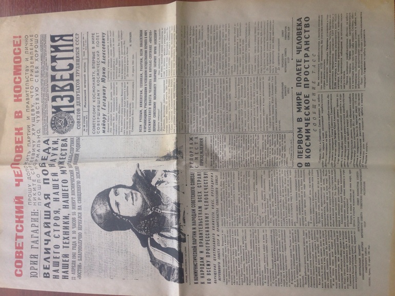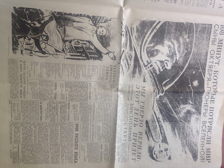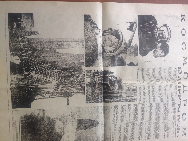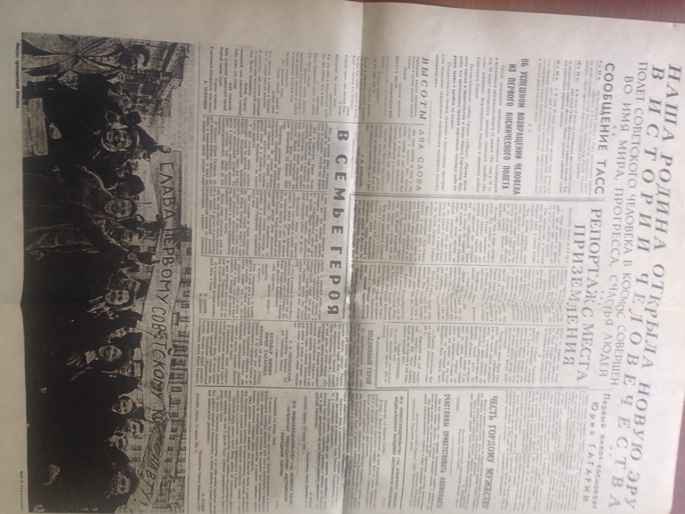 Смотрите, что я нашла, разбирая архив, это выпуск газеты за 12 апреля 1960 г. Про первый полет в космос и нашего Гагарина.