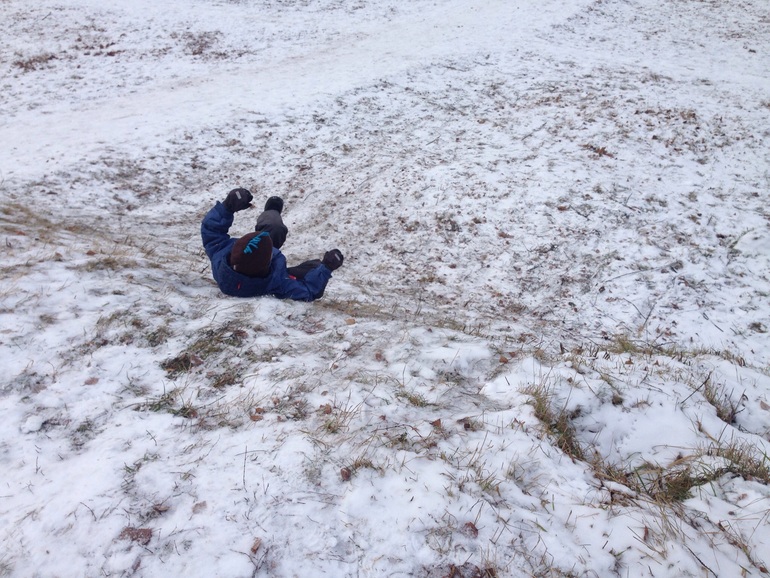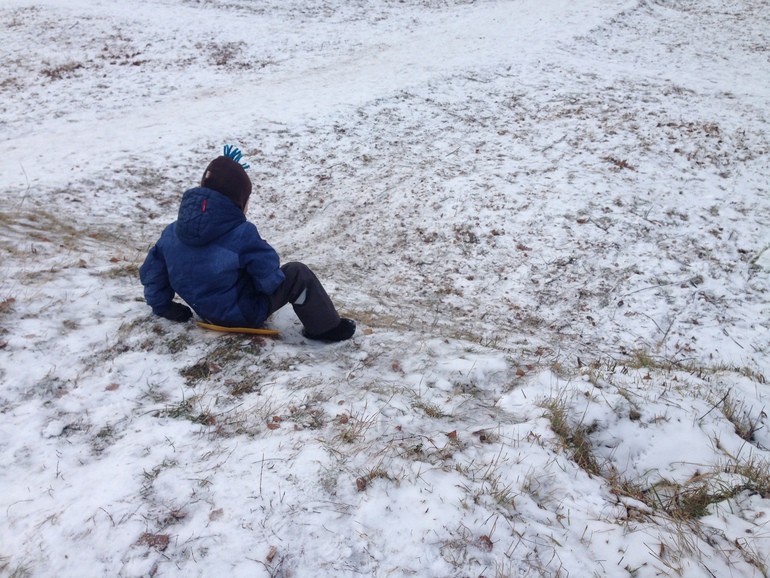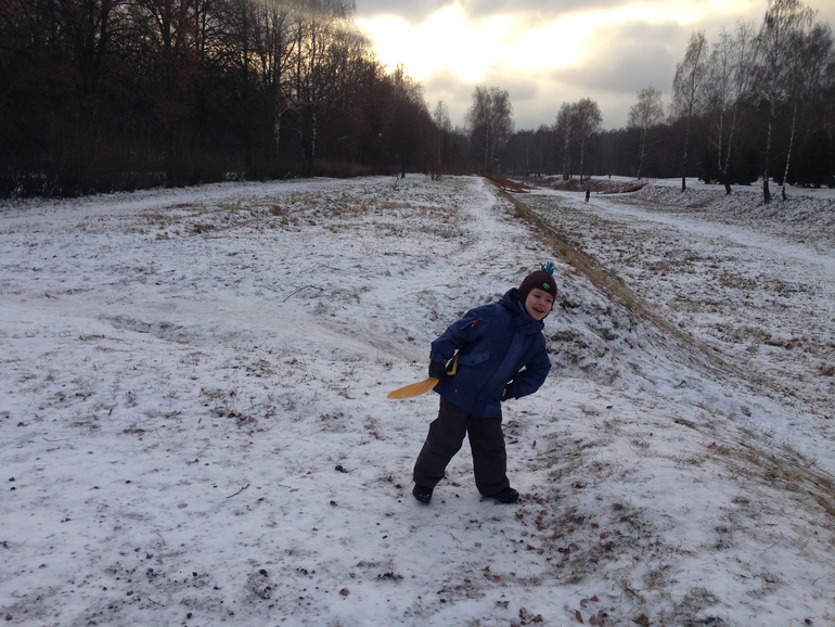 Ребенок изнылся, где же снег, давай покатаемся с горки. Вот и покатались на том, что было.(( Ватрушку не разрешила, боялась лопнет, нарвавшись на какой-нибудь камень, но деть и ледянке был рад.) Встретили нашу подружку, те тоже с ледянкой пришли, хоть не одни такие сумасшедшие оказались.))