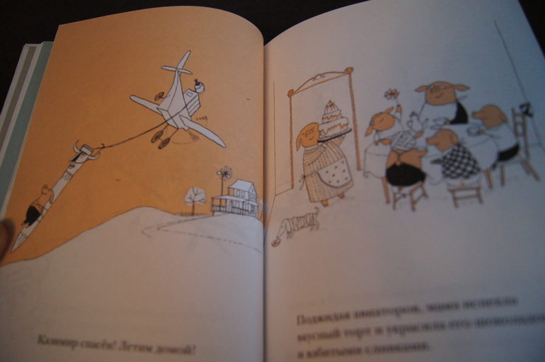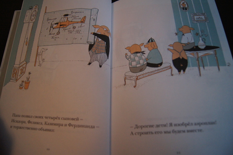 Эту книгу перечитывали уже раза 3, благо текста на каждой странице немного, все дано в этаком комиксовом формате. Смешной текст, смешные иллюстрации, кстати автор и художник- это одно лицо- Томи Унгерер. И он за свои книги, точнее иллюстрации к ним получил "малую нобелевскую премию"!! В книге 5 небольших историй о похождении неугомонной семейки свинов: папы и его 4-х сыновей, мама обычно оставалась дома и дожидалась своих оболтусов с вкусным тортом.
