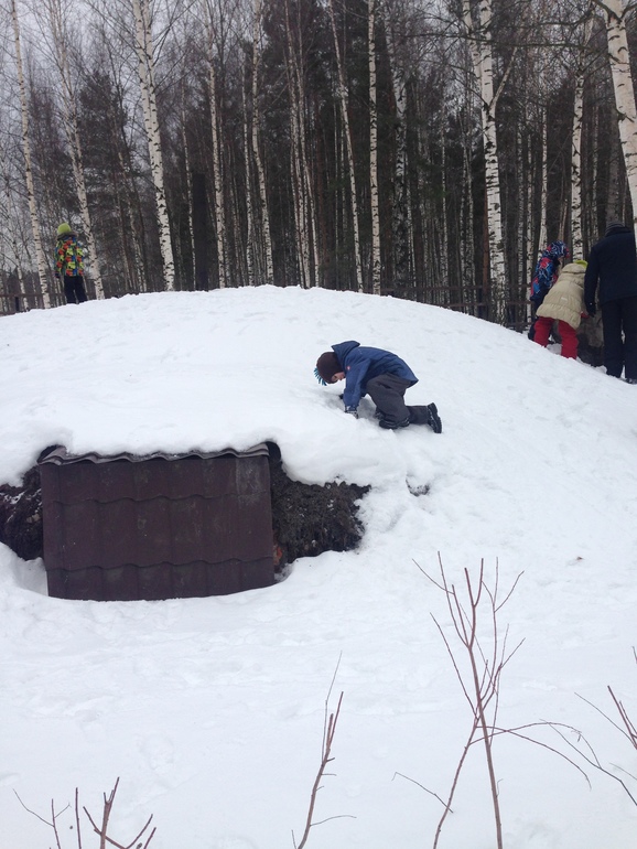 Немного еще погуляли по территории, сын увидел старую земляку, засыпанную снегом, вот полчаса наверно забирался туда-сюда на нее. Люди разошлись и экскурсовод разрешил войти в вольеры к лосям. Лоси были сытые, довольные жизни, лежали, а мы их гладили.)))
