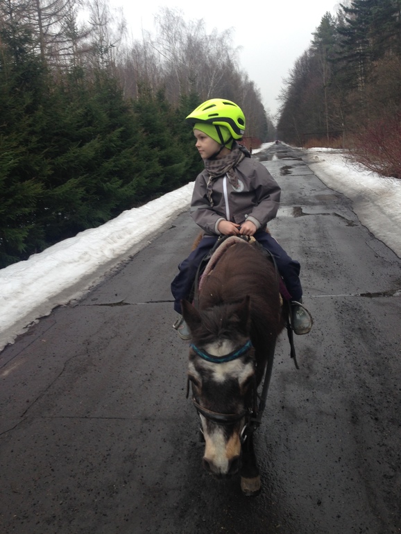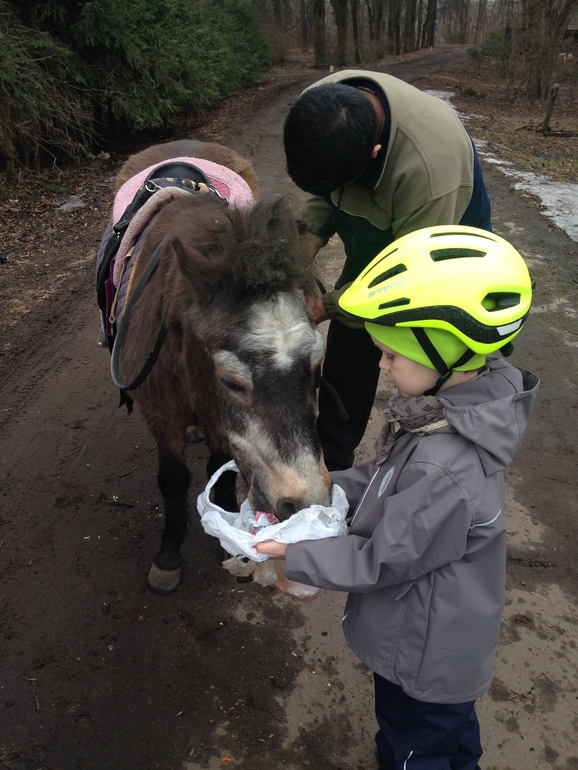 Сегодня достали наши велосипеды из гаража, да...как более-менее подсохнет все, надо заехать на мойку и чтоб их там помыли, а то выглядят грязноватенько.)) Доехали до площадки, адрес Пионерская, 30, корп.9. Такая она все-таки необычная, часик там потусили, а потом поехали к конюшне. В лесу холодно, все были в ветровках, одному Никите я взяла перчатки и флиску, вот ему было хорошо, даже муж, накинул капюшон, хотя стебал меня, что я достала из рюкзака шапку.)) Ну и местами на дороге был не растаявший снег и лужи, так что ехали очень медленно и аккуратно, но все равно иногда колеса сильно заносило. Доехали. Конюшня стоит.)) Лошади еще немного в "зимней" шубке.)) Любимый пони Беня еще больше поседел. У Никиты почти полностью прошел страх перед лошадьми, что его опять укусят, так что лошадок кормил вовсю. Зато я боялась, как вспомню как тогда его конь цапнул, чудом, что пальчики не перемолол. В общем здорово, деть нагулялся, даже перегулял и был в шаге от истерики, когда я окончательно сказала, что спать нужно, но сдержался, хотя и пообижался, похлопал дверьми.))