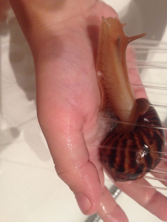 Ну очень любит купаться, аж чуть ли не полностью высовывается из своего домика, а еще пьет воду ну очень слышно, звук такой ууть-уууть-ууть.)Ну и подросла, уже так осязаемо выглядит на детской ладошке)