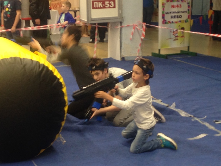 Как всегда ребенок поучаствовал в мини-войне с электронными автоматами или как эти штуки называются. Его команда ни разу не проиграла (было три раунда), сына ни разу не пристрелили, но буду честна, это заслуга двух взрослых мальчишек из его команды, они им рулили, говорили, когда надо пригнуться или перебежать на новое укрытие.