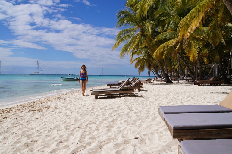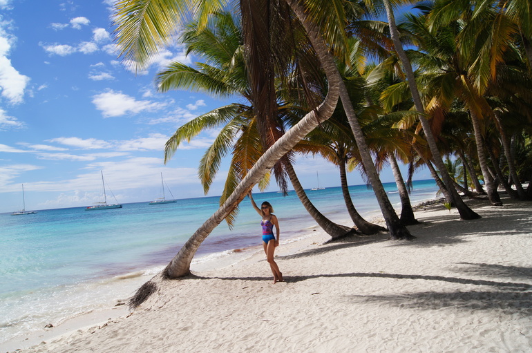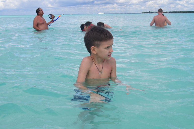 Следующей остановкой был остров Саона. Сначала расскажу смешную историю от нашего гида, а гиду, в свою очередь, рассказала ее коллега. Подходит к той коллеге мужчина из группы туристов, приехавших на остров и ржет. Его жена пару дней назад поставила в известность, что они едут в саУну, он еще удивился, нахрена столько лететь, чтоб в сауну поехать, лучше б на какую-нибудь экскурсию собрались, еще и вставать ради этого в 6 утра. Но раз жена сказала в сауну в 6 утра, значит в сауну! И вот тот самый «банный» день, раннее утро, они вышли на ресепшн, сели в экскурсионный автобус и там еще 40 человек, которые тоже едут в сауну... Он такой, что происходит? Что за групповое посещение сауны в Доминикане, но все равно молчит... И только когда гид стала рассказывать про остров Саона, он все понял...))) Ну а теперь про сам остров, его также открыл Христофор Колумб, в настоящее время он является природным заповедником и в связи с этим, там отсутствуют отели да и вообще запрещено любые капитальные постройки на береговой линии, только хижины. Поэтому в основном туристов туда завозят на несколько часов, понаслаждаться местными красотами, поплавать, тк Карибское море теплее Атлантического океана, на котором и расположены почти все отели в Доминикане, в том числе и наш. Ну и конечно, сделать красивые фотографии, по уверениям нашего гида, именно здесь снимали рекламу Баунти. Все действительно красиво, сочно, «вкусно», мы даже не стали уходить чуть подальше по пляжу, так как и в том месте, где базировалась наша группа, квинтэссенция «баунти» зашкаливала. Детенышу тоже все понравилось, он нашел сначала каких-то насекомых типа ос, потом муравьев...потом где-то кто-то крабиков увидел и с другими мальчишками начал их искать, ну и наклонные пальмы, на них же можно залазить..счастливый, он еще не понял, что такое сделать красивую фотографию в новом и интересном месте, короче, у сына тоже поездка прошла не зря.