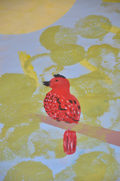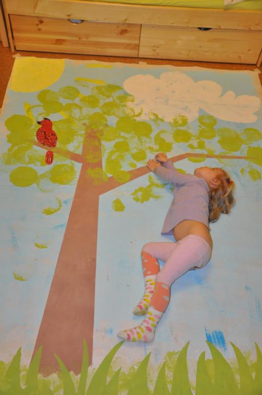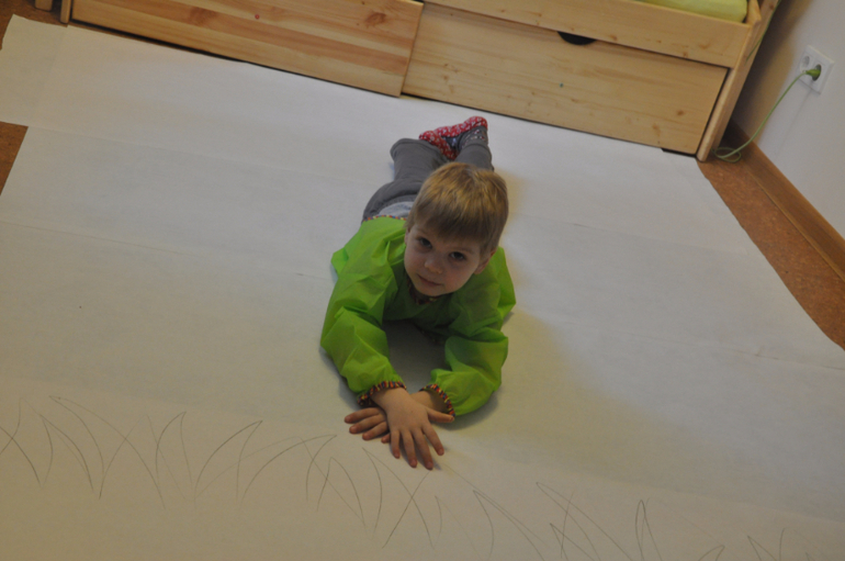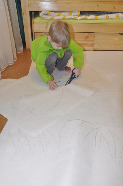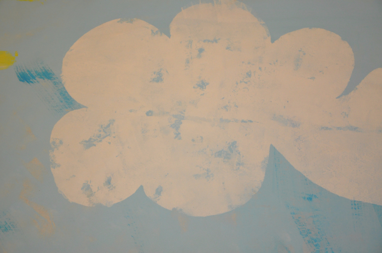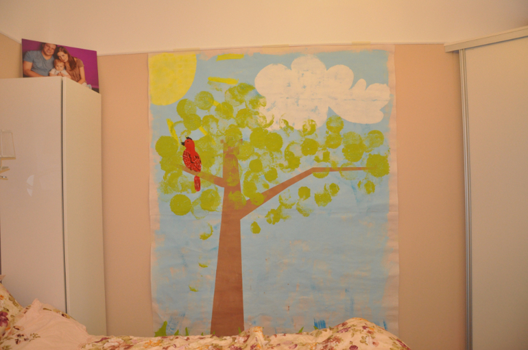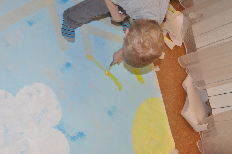 Холст был размером с нашу детскую комнату, большего пространства у нас в квартире и нет. )) Использовали шаблоны, которые тоже вырезали из обоев. Облако, траву, птичку и солнышко.