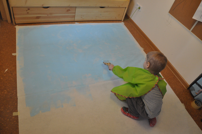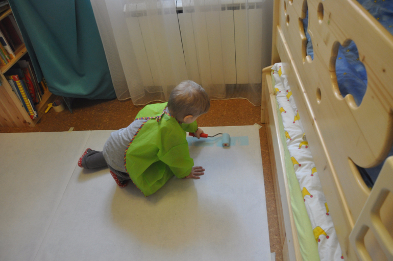 Самое большое, что смогли найти - обои, купили в Леруа специально для такого случая. Решили работать настоящими малярными инструментами - валиком и кистями. Краски тоже брали те что остались от покраски стен, добавляли уже обычные акриловые или гуашь.