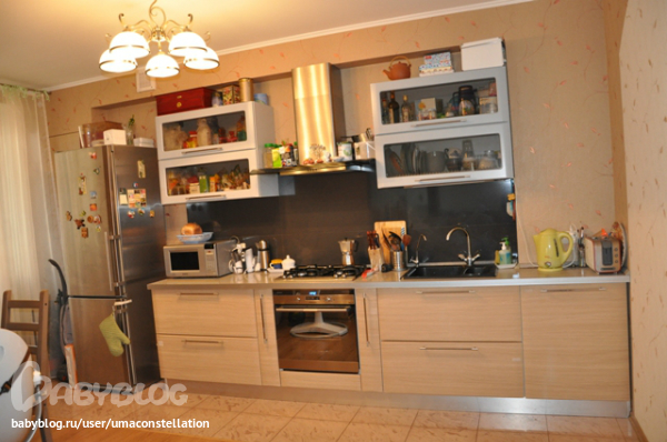 Большая кухня (~15м) с лоджией, частично (аркой) совмещена с гостиной (~22м). Установлена система очистки воды (обратный осмос). На лоджии в кухне стеллаж.