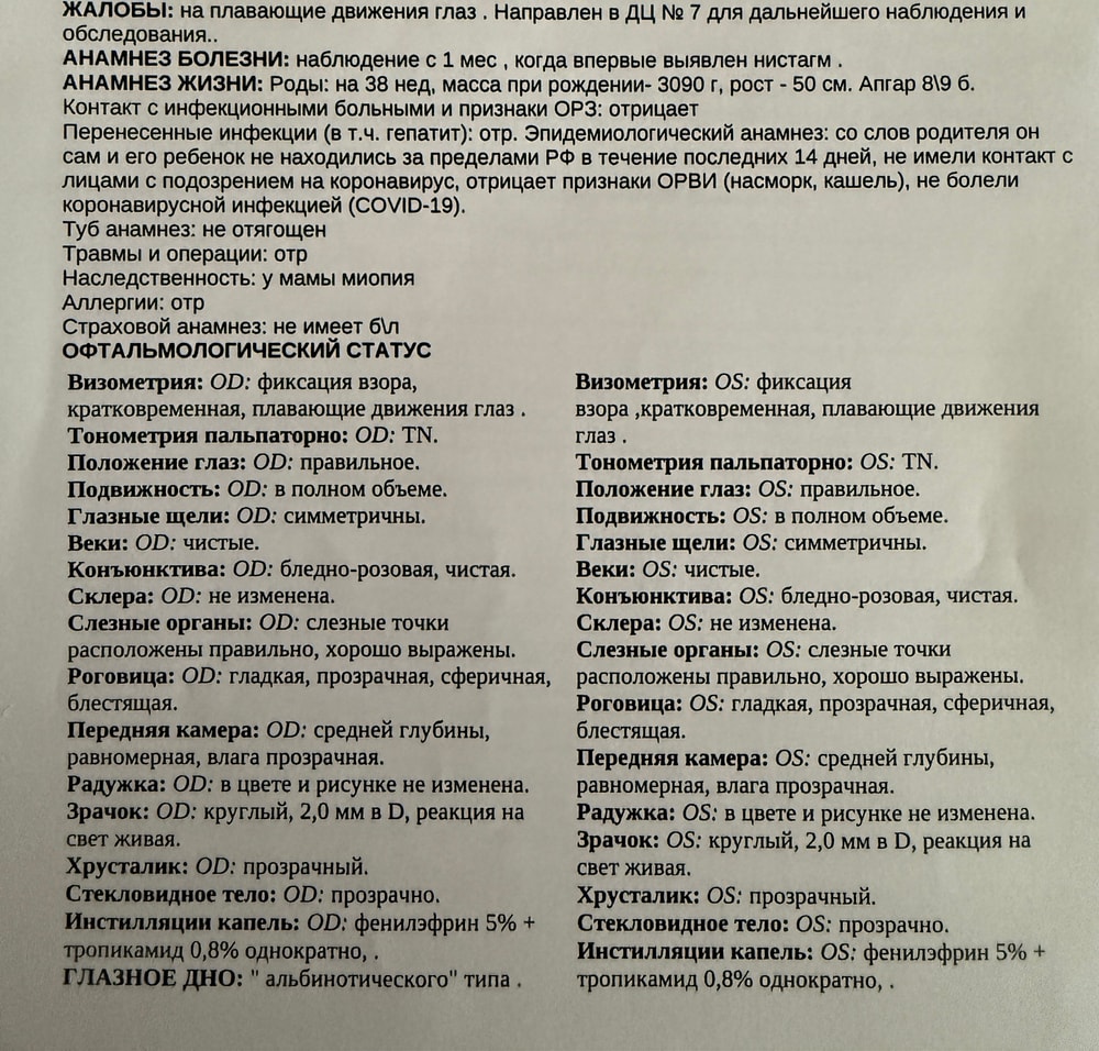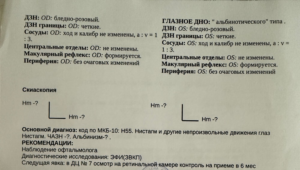 Осмотр офтальмолога (прикладываю) - поставили под вопросом ЧАЗН, альбинизм.