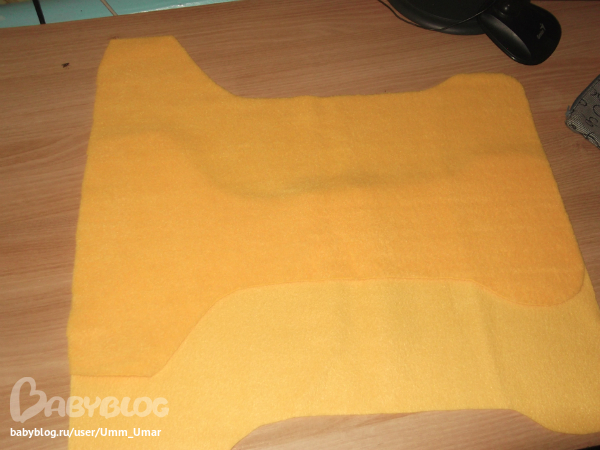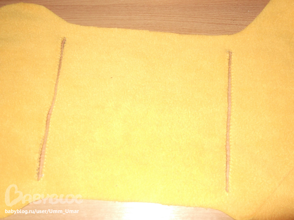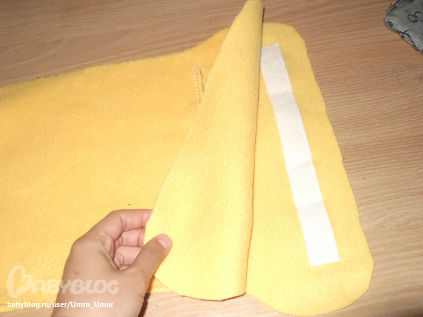 это (разрезанная) у нас внутренняя сторона,на внешнюю мы пришиваем липучку на положенное место(я думаю что не надо уточнять,где она обычно располагается),и потом сшиваем обе половинки выкройки,липучкой внутрь,по краю,не оставляя никаких дырочек,потому что для того,чтоб вывернуть у нас есть дырочки от кармашка