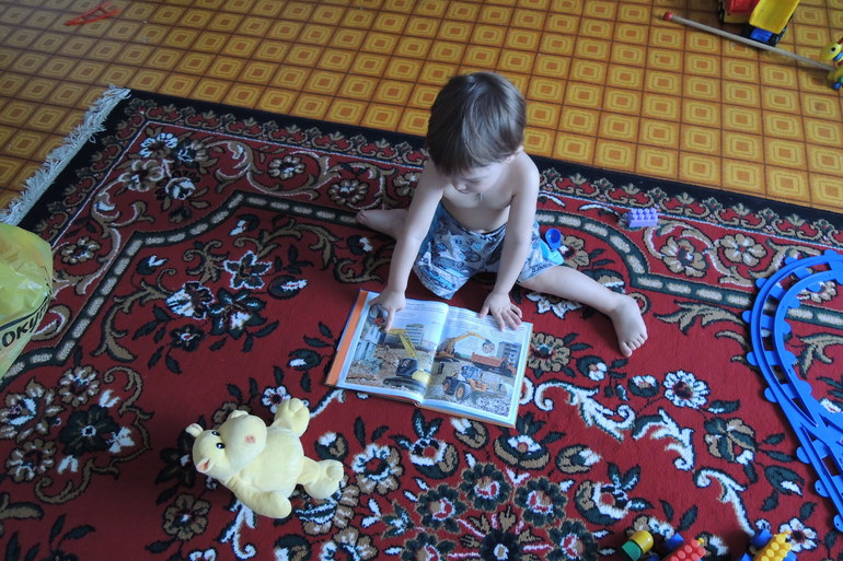 Книжки часто рассматривает вверх ногами, я думала раньше, что это случайно, но нет, он специально так поворачивает. Винни Пуха так слушает, книжку про строительную технику.