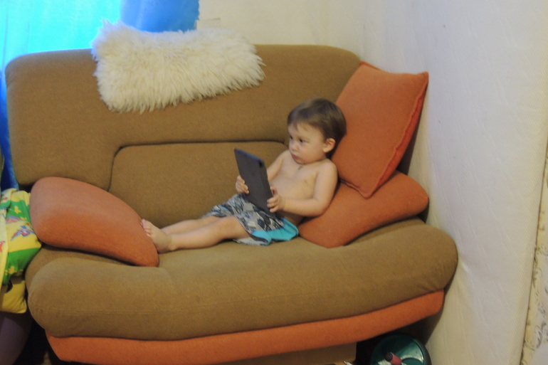 Не очень удачный кадр, но я от этого зрелища долго хохотала, это он скопировал меня. сидел и "читал" мою электронную книгу, да еще с таким серьезным видом. Потом закатился смехом вместе со мной, хотя поначалу держался, наверное все силы ушли на то, чтобы состряпать серьезную мосичку. Вообще Тихон сейчас что-нибудь изобразит, а потом сам больше всех покатывается со смеху. Страшный хохотунчик.
