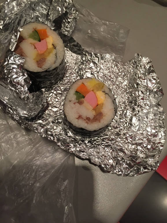 У коллеги мужа был день рождения. Коллега угощал самодельными суши и ролами. Муж принёс и мне, угоститься. Внутри рола: рис, морковь, огурец, варёное яйцо, крабовая палочка, обжаренный фарш, предположительно свиной, какой-то странный овощ, похож на капустную кочерыжку и сосиса!!!. Кто не верит, ловите фото