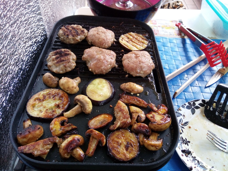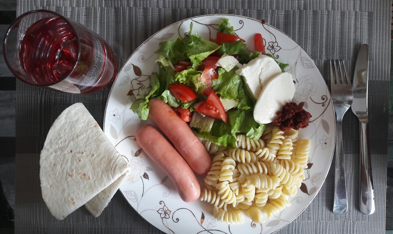Был борщ (на этот раз горячий, ибо температура за бортом ощущается как +6), котлеты печеночные и макароны.