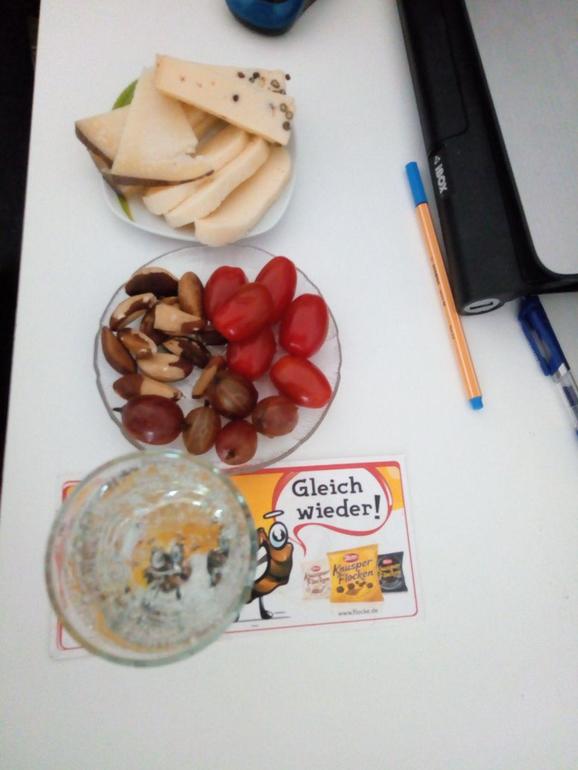 завтрак: 3 сыра, орехи, помидоры-черри, крыжовник, минералка (кофе уже обпилась :) )