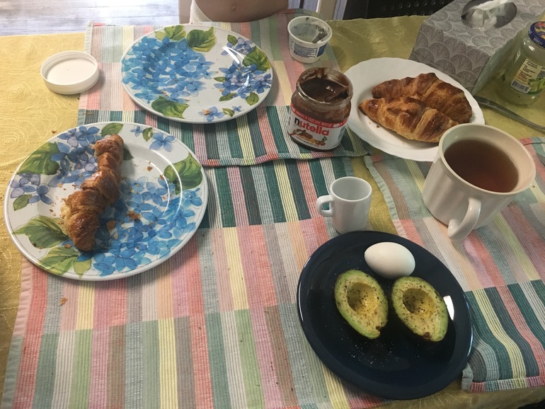 В выходные встала в 6 утра и замесила круассаны дети едят йогурт и круассан с нутеллой, у меня авокадо, яйцо и просто круассан. пью чай лапсанг сушонг. дети пьют преимущественно воду