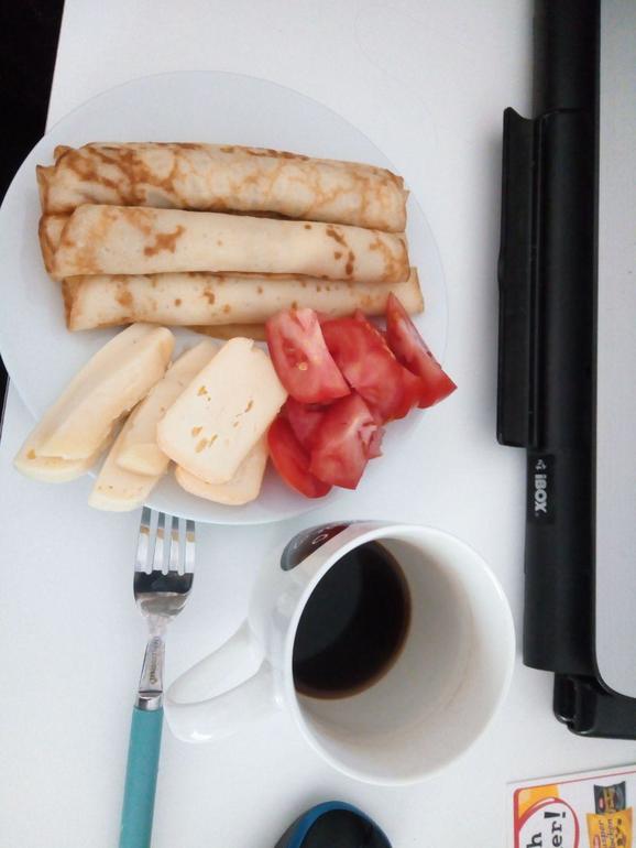 хипстерские безглютеновые блинчики на кокосовом молоке жаренные на кокосовом масле (made by хипстер-муж) + два сорта вполне обычных пролетарских лактозных сыра + помидорка + почти выпитый кофе