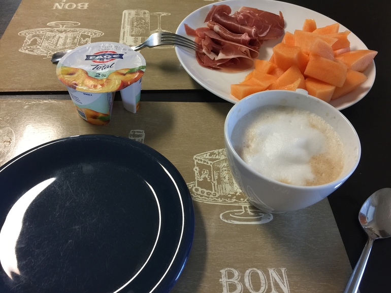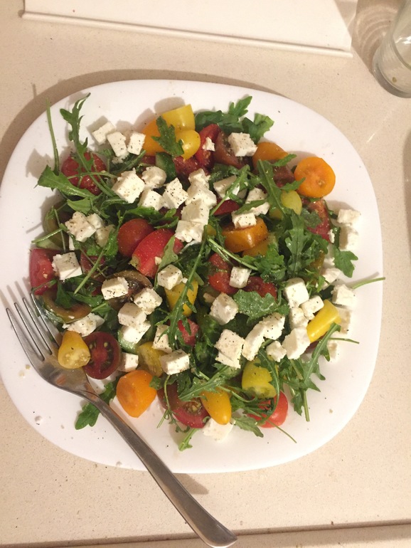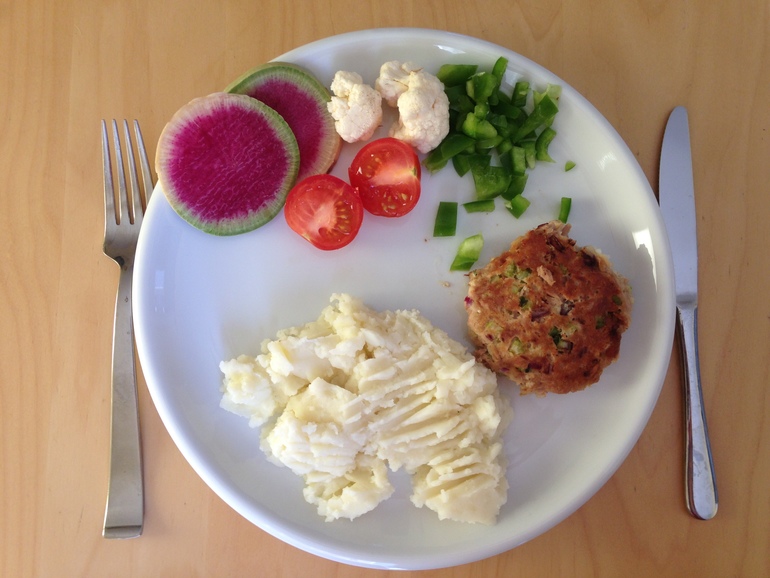 Обед: тунцовая котлета с надоевшим пюре и ненадоевшими овощами.
