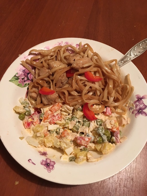 Лапша пшеничная (покупаю в перекрёстке) варб по инструкции (3 минуты), тем временем обжариваю куру в терияки, добавляю лапшу, закрываю крышку, на медленном огне держу. Потом перемешиваю и сверху посыпаю свежий болгарский перец. Надо б еще кунжут, но я забыла)))