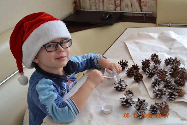 Вот наш эльф трудится, кроптит над заснеженностью шишек, снега-то в этом году у нас всё еще нет...