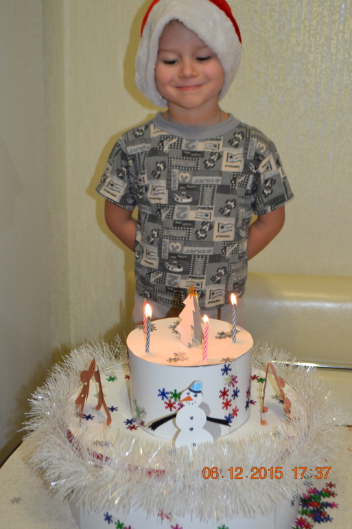 А еще мы делали зимний торт, и не просто торт, а с сюрпризом (о сюрпризе Максимка еще не догадывается). Это торт в детский сад, там коробка откроется и окажется полной подарков для детишек.