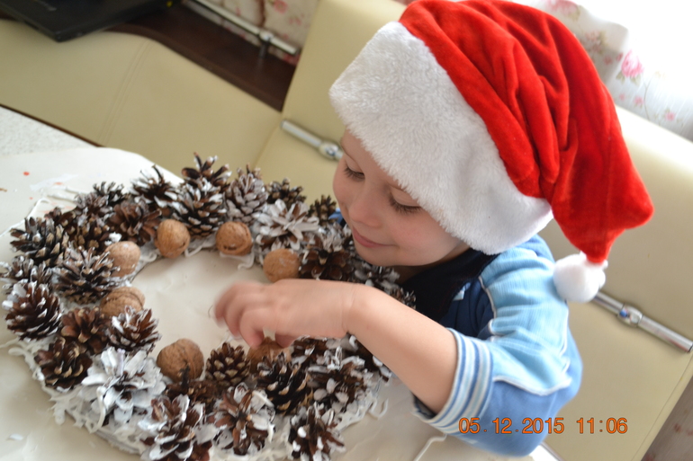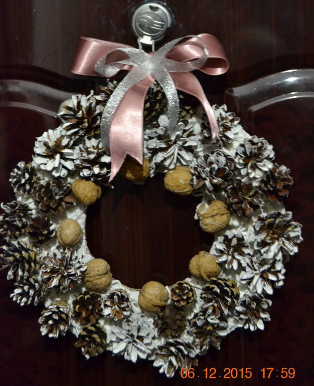 Вот такой красивый рождественский венок на входную дверь у нас получился