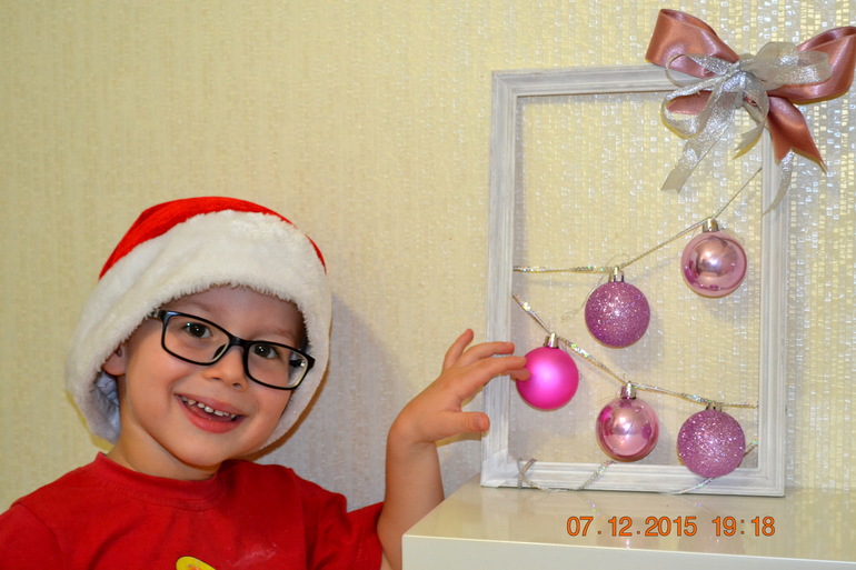 Все просто - Максим покрасил белой краской обычную деревянную рамку, вместе детским молотком забили канцелярские кнопки-гвоздики. Нанизал шары на блестящий шнур, а я закрепила на гвоздики - красота!