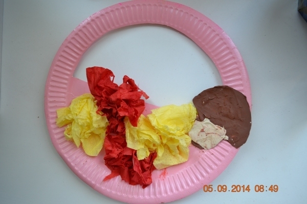 А в эту корзинку Максим насобирал цветов, вот еще и грибочик собрался (пластилин размазывал по пластику, а потом вырезала). Кстати, цветы из салфеток Максиму очень понравилось комкать и клеить, надо будет еще с этой идеей поработать.