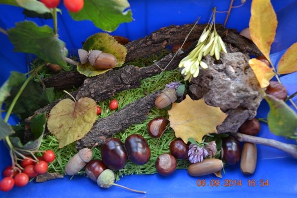 Нашли желуди и каштаны, обсудили, что каштаны открываются из скорлупок только осенью. Каштаны мы любим, такие же гладенькие и приятные на ощупь, как камушки. Нашли кору дуба, пригодится...