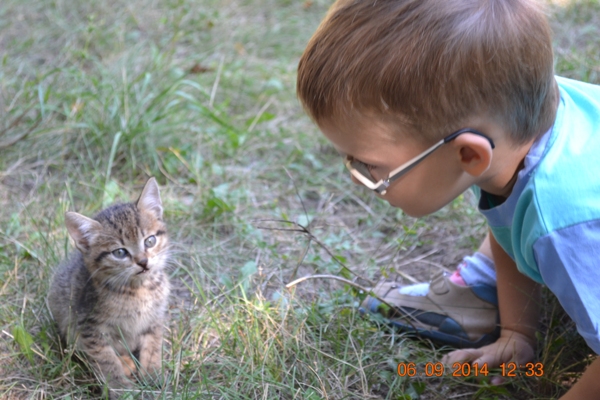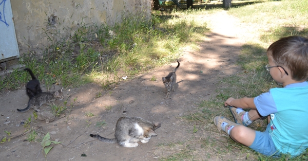 Нам на встречу выбежало 4 крошечных клубочка: черный, серые и пятнистый. Какие же хорошие эти малыши, так захотелось вспомнить детство и взять себе домой котенка (мне разрешали, у нас всегда жил кот в квартире, правда терялись они, то выбежит на улицу и не догнать, то в форточку выскочит, я горевала - не приживались, поэтому маленькие котятки у нас бывали часто). Сейчас я бы не рискнула завести котенка, Максим бы его замучил, наверное. Мы побежали домой, взяли молока, котлету и отнесли бедным животным, а Макс говорит :" У котят будет пикник, мама?":))