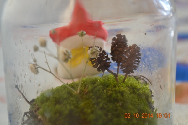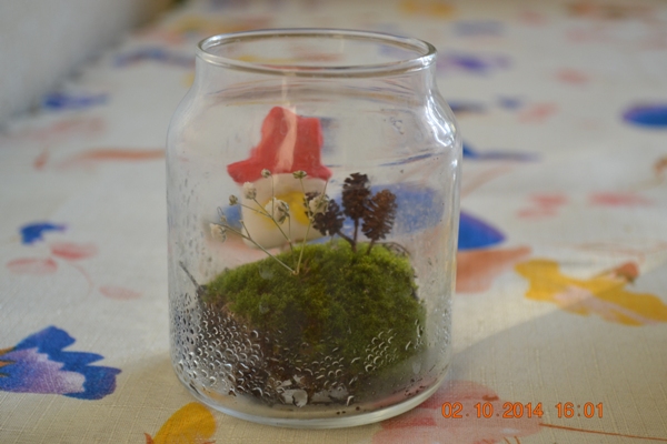 Сделаю в маленькой баночке зеленый мирок из мха, с маленьким деревцем и домиком...