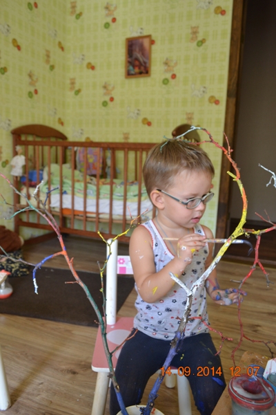 Сейчас у нас развита тема о гномиках, он прячет для Максимки подарки, а малыш их ищет по квартире, даже живет у нас на разукрашенном Максимом волшебном дереве. Волшебном потому, что мы повнимательнее присмотрелись к этой коряги и обнаружили, что она вся состоит из букв "У". Максимка нашел абсолютно все буквы "У" на ветке и раскрасил их разными цветами.