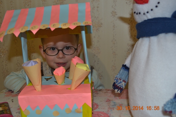 А тележку быстро сделала из картонной коробки и цветной бумаги, морожко - из бумаги. Да из коробков и бумаги можно сделать практически все.