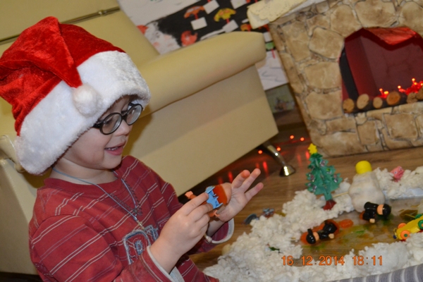 Сенсорная коробка на этот раз вылезла за пределы коробки:) На пол перед нашим камином положила стеклянную полку из-под холодильника - это каток. В кубиках льда заморозила человечков - на коньках, и паровозик - к нему вагончики изо льда, снеговичок настоящий из снега, он у нас в морозилке живет и тоже бывает Максу сюрпризы готовит. Снег разложила за пределами полки со льдом - наполнитель для подушек (убирать его легко, не то, что сыпучие:)