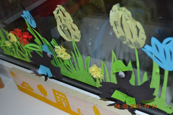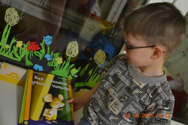 Воробушки приготовили для Максима сюрприз. В комнате у Максима расцвел садик и ему нужно было его найти. На стекле - весенние вытынанки, а возле них книга "Как мышонок учился читать".