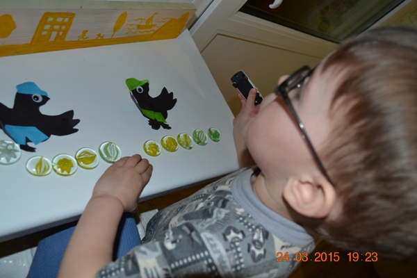 Когда воробушки были склеены, они сказали, что для Максимки спрятан сюрприз. Максим быстренько нашел картинки к сказке про наших воробушков и история началась...