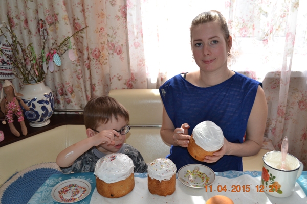 Максим немного помогал украшать куличики. А еще впервые готовила творожную паску - это очень и очень вкусно!!!