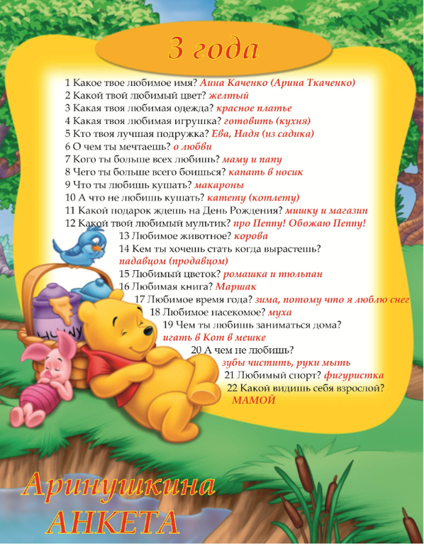 Порадовал последний пункт)))) Так милооо) Моя такие развернутые ответы дает только в очень хорошем настроении)))) Надо тоже опросить, ведь завтра уже 3!!!!