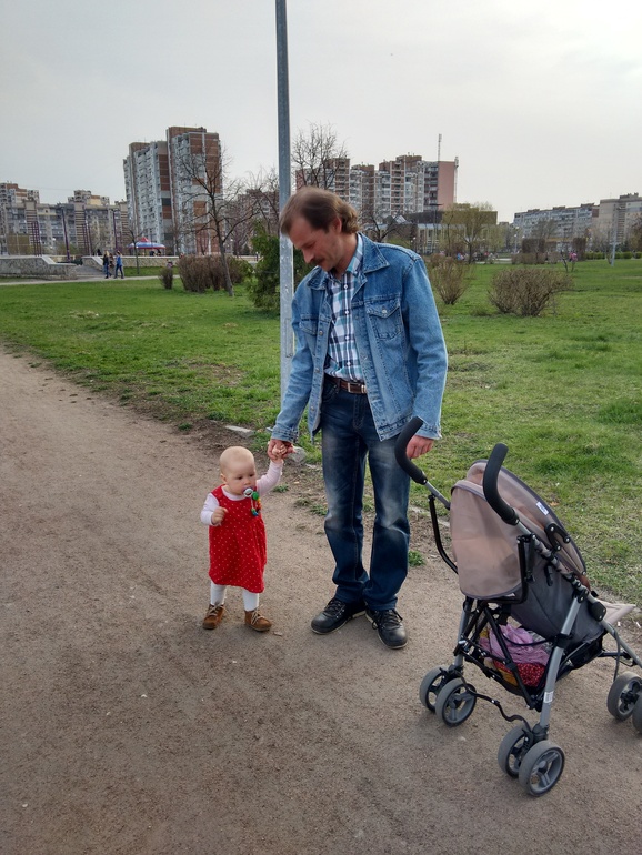 На площадки детские мы в основном ходили на Троещине, у папы, и еще в Голосеевском парке. Площадки во дворах домов ( у мамыного дома на м. Лыбедской в том числе) представляют столь грязное и печальное явление, что я не рискнула бы туда и сама пойти, без ребенка... На Троещине в районе конца улицы Бальзака есть большой парк, кажется возле поликлиники. По словам папы - это единственное более-менее зеленое и облагороженное место для прогулок с детьми на ближайшие несколько кварталов. И правда, я давно не видела столько людей с детьми в одном месте, а Маша была удивлена и постоянно приставала ко всем познакомиться. Лично я была удивлена тем, насколько тепло были одеты местные дети: при порядка +18 на улице большинство детей Машиного возраста еще было в демисезонных комбинезонах, шапках и шарфах. Поэтому неудевительно, что мой бегающий в одной кофте и изучающий всякий растительный мусор ребенок, невольно привлекал внимание ;)