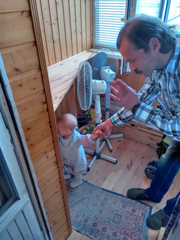 А это уже на Троещине, у папы на балконе. Маша обнаружила кучу кнопок на старом вентиляторе и была занята ими минут 30. Технический человек растет ;)