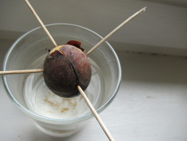 Сьев авокадо Маша заинтересовалась его косточкой и было решено вырастить собственный авокадо дома. Сначала мы прикрепили косточку на зубочистки и опустили нижнюю ее часть в стакан с водой.