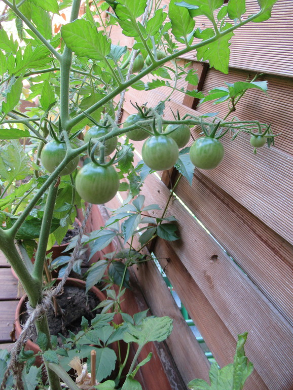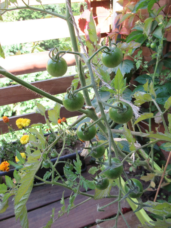Урожай с черри мы снимаем зеленым: помидорки отлично дозревают на подоконнике,а "обманутый" куст помидора завязывает новые плоды. Маша очень удивлялась, что за неделю в мисочке помидорки краснеют не хуже, чем на кусте. И еще больше поразилась узнав, что большинство овощей в супермаркете за редким исключением покидают грядки и теплицы еще совсем зелеными, что бы пережить транспортировку.