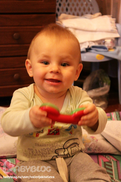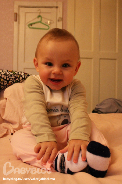 Стали пытаться ползти. Не очень успешно, но начало положено! ))) Говором много: мам, пап, баб, мама, папа, баба, дядя, деда, тата, дать, вотьэта, иди, да, вава, адя, адын и пр.