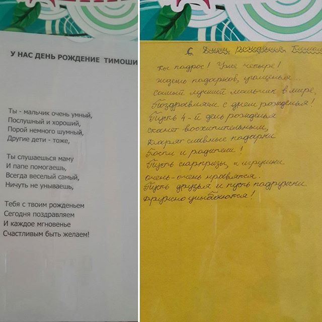 ТимочкаДень рождения уже прошел. Прошли даже все 3 этапа празднования: 1. С родными, 2. С друзьями, 3. В аквапарке. Теперь есть что вспомнить. Вот такие милые у нас поздравления от воспитателей. С утра было от одной воспитательницы, вечером поздравления от второй Такие вот мы особенные ☺