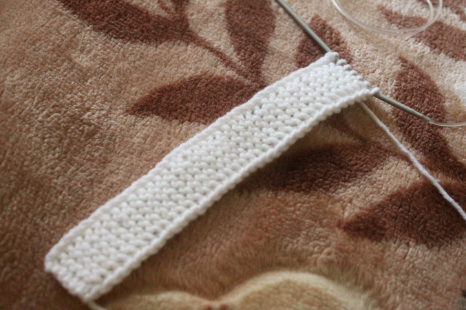 Начнем вязать с ушек. Для каждого ушка нитью белого цвета набрать 7 петель (5+2 кромочные) и вязать 71 ряд платочной вязкой (и лицевые и изнаночные ряды лицевыми петлями).