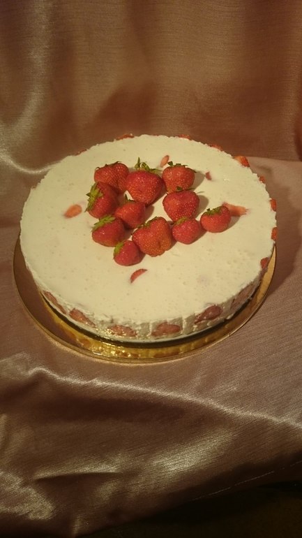 под основу я брала бисквит тоненький ,чуть его пропитала,по бокам формы выложила нарезанную клубнику,сверху вылила смесь,в нее тоже положила кусочки клубники,все было в форме разъемной форме.застыло часа за 3-4,я убирала на ночь в холодильник .