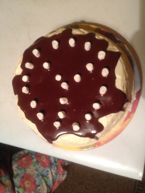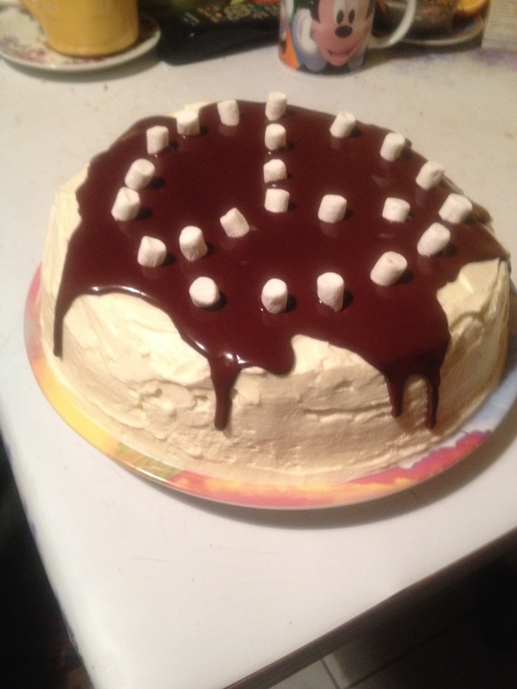 Смотрела передачу с Бади Валастро, он для сына сделал шоколадный бисквит, шоколадный крем, сверху крема посыпаны грецкие орехи. Белый сделала, крем чиз, перечитала наверно все сообщество КОНДИТерское, сверху ганаш, ну и снег в виде мини маршмелоу. Пробу пера снимать будем завтра.