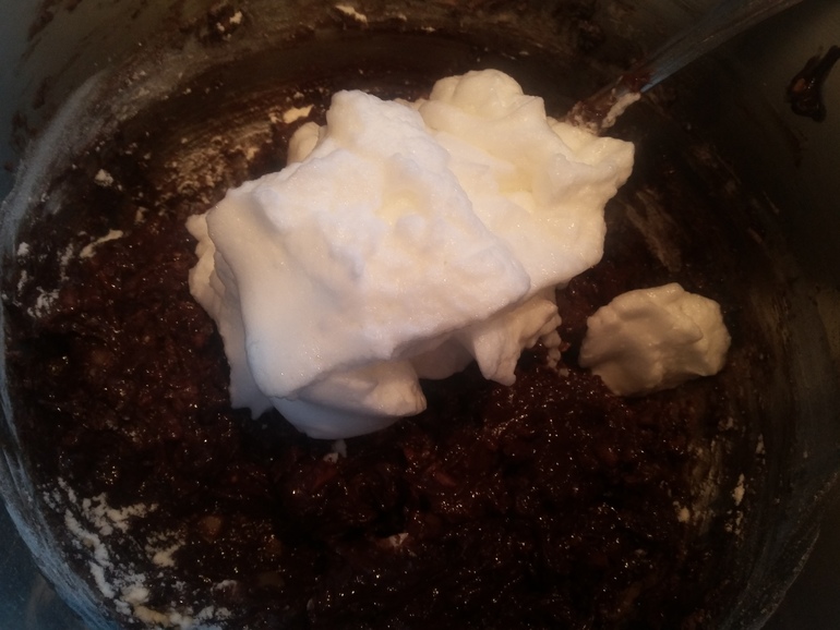 В три приема добавить белки, перемешивая массу: