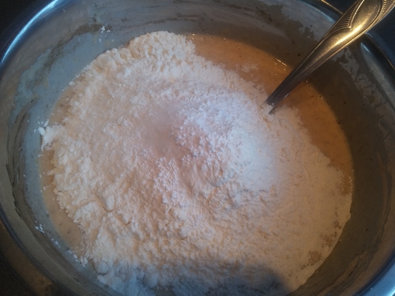 Всыпать 400 г муки и 1 ст.л. разрыхлителя: