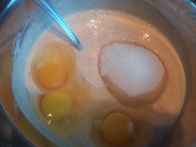 Добавить 150 г сахара, 3 яйца: